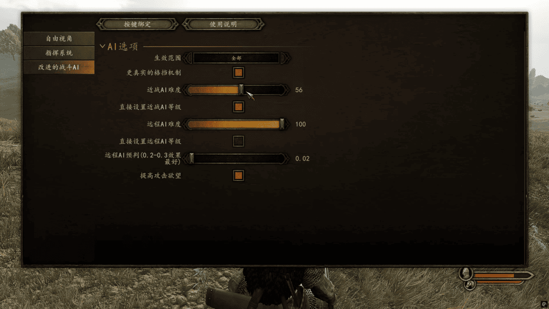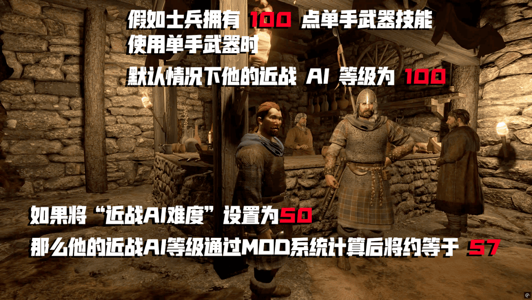 而近战AI难度则是在战斗AI等级的基础上,再进行计算。例如,如果一名士兵拥有 100 点单手武器技能,当他使用单手武器时,默认情况下他的近战 AI 等级为 100 。如果将“近战AI难度”设置为50,那么他的近战AI等级通过MOD系统计算后将约等于 57。当然了,骑友们还可以直接设置每个士兵的战斗AI等级。那么在确定战斗AI等级时,武器技能就会被忽略,所有单位都会有你设置的战斗AI等级。