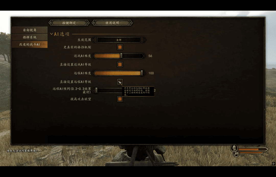 通过“L”键来调出改进战斗AI的调整菜单,这里特别提醒一下,如果骑友们已经装载了“RTS自由视角”也不用担心找不到此MOD的调整菜单,按下“L”键后在RTS自由视角的菜单页面即可找到此MOD的调整菜单。
