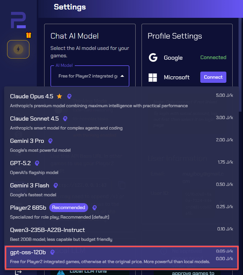 进入player2的官网(https://player2.game)下载并安装好之后,双击运行程序,Player2默认的AI模型每天大约提供50次免费对话次数,同时也为大家提供了免费的AI模型,在设置的Chat AI Model里选择gpt-oss-120b即可!缺点是AI表现力会比较弱。