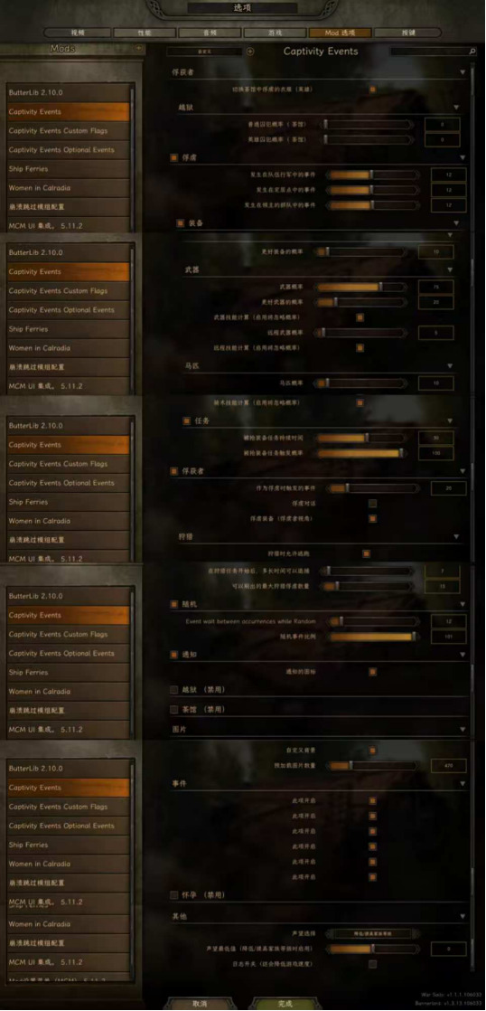 由于当前版本无法导入预设,进入游戏后,请立即打开MOD选项,在zCaptivityEvents界面调整选项(如下图)。