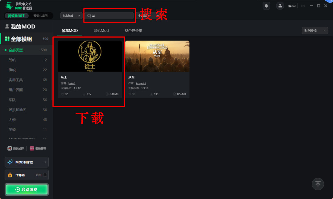 也可以直接百度搜索“骑砍中文站 下载中心”,进入下载站后搜索“从士”进行下载。