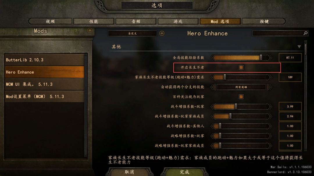 总是被角色死亡影响游玩体验!只需在MOD选项中开启长生不老,你将会无所顾忌,爽玩自己的霸主生涯,同时也能够让玩家家族成员拥有此项天赋,避免本就少的可怜的族中精锐意外身亡。